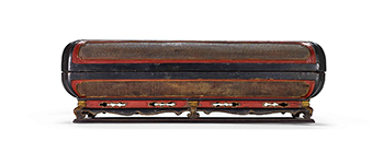 下身與上蓋同樣四邊開雲窗嵌細銀絲,上下呼應,更顯穩重,束腰開窗,下銜三彎腿,流線型牙板,比例勻稱而協調,足上以紅漆打底金漆描花,更顯細緻華貴,六足相連,氣韻相通,平衡有致。