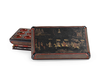 黑漆長方盒,上蓋四邊開雲窗嵌細銀絲,雲窗邊起細線包窗,精緻秀氣,四邊倭角,圓中帶方,可見巧思,蓋面繪狩獵圖,以金漆、黃漆、紅漆描繪人物,各人衣著及表情皆有不同,人物生動而線條流暢,鑾轎傘輿各有所司,栩栩如生躍然於上。