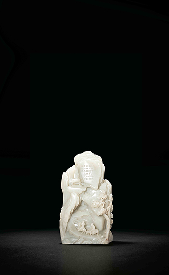 山子以整塊玉雕製成,一面兩高士正沿山路騎鞍而上,周圍古樹參天山巒疊嶂,遠處山頂有一幽亭應是主人公趕赴之地;背面刻畫險峰峻山之中兩位高士一坐一站正觀瀑論道;整件作品用料碩大,雕刻生動,品味高雅,更為難得之處在一面山坡之上陰刻有乾隆御題詩,此詩被記錄在乾隆御題詩文集中,結合料工題材和銘文等信息綜合判斷此山子是一件極為難得的文房擺件。