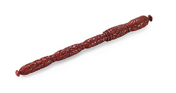 通體髹朱漆,頂部雕盛開的菊花一朵,筆帽及筆身遍布葵花,朱漆色澤肥厚鮮麗,刀法精細嫻熟,極富立體感,可見明代雕漆在發展的基礎上,得到了輝煌的成就。