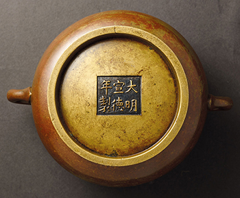 通體精銅鑄造,圓口平唇,束頸溜肩,肩兩側出線條凝鍊的蚰龍為耳.。廣圓腹,腹下漸收,下承外撇寬圈足,底署方框「大明宣德年製」三行六字楷書陽文款。是器底部外露金黃色澤的優美銅質,外壁滿罩棗紅色皮,唯皮色因年代斑剝之故,更顯光影搖曳的流動氣息,予人無限遐想!