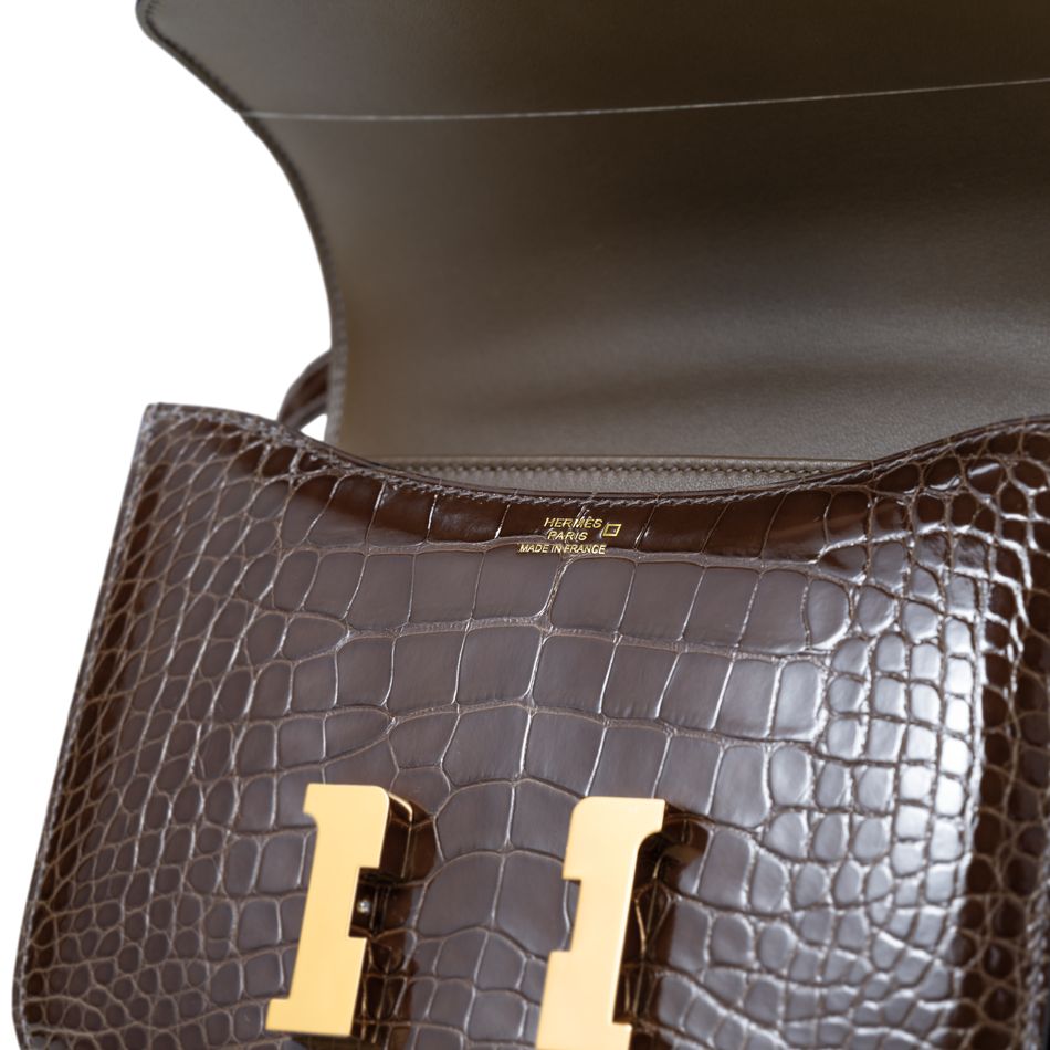 亮面象灰色ALLIGATOR短吻鱷皮18公分迷你CONSTANCE包附金色金屬配件