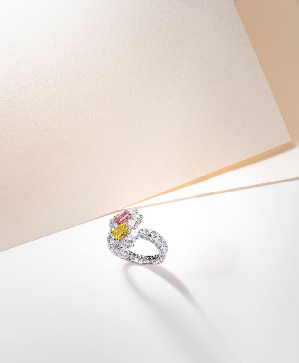 A 0.54 CARAT FANCY INTENSE PURPLISH PINK AND A 0.75 CARAT FANCY VIVID YELLOW DIAMOND COCKTAIL RING