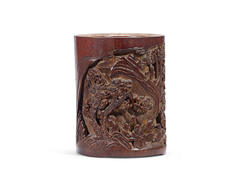 筆筒呈筒式。外壁刻高士坐于庭苑松蔭下,足顯文人隱士生活情趣。陰刻技法琢制人物表情、山石、枝葉末節等細微處,以呈現立體感,層次豐富。