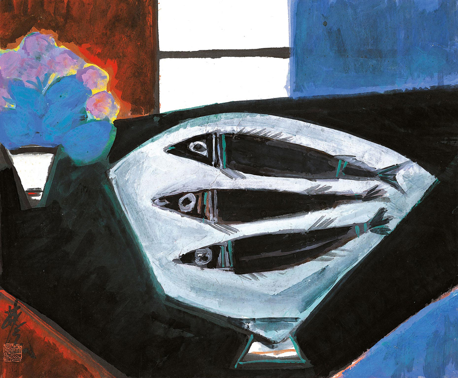 《魚盤瓶花靜物》堪稱為林風眠靜物畫中的逸品,創作時間約為1977年離開上海、前往香港前後,率真寫意,富有拙趣。無論案桌、魚盤、小瓶花,形體皆可愛,錯落佈局和諧而不唐突,彼此相映成趣。尤有甚者,畫面上方的窗櫺,頗有馬蒂斯抽象化窗景的味道。若非經過現代美術洗禮,無法巧妙完成此幅既古雅又現代感的彩墨創作。