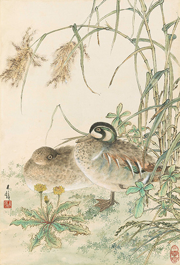 Huang Junbi was highly recognized by his majestic landscape paintings. Little has been known for his Song Gongbi Style techniques which are meticulously employed and his gongbi paintings equally stunned art critics since. In this oeuvre, a pair of mandarin ducks were depicted among the reeds and chrysanthemums. Each subject carries their own representations and together they form a blessing to a couple’s married life and prosperity for the family.