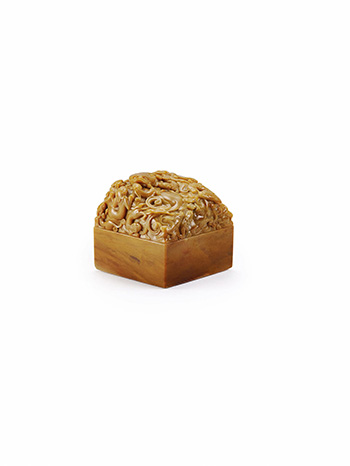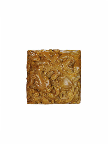 歷史記載,和碩怡親王督導清造辦處,為雍正皇帝倚重親王,此印刻劃十八隻螭龍盤據,設計巧思,造型優美,與北京故宮藏之雍正印信一致,因歷史因素流落歐美,經由2008年香港蘇富比拍賣之後,再由藏家於北京保利2013年拍賣取得,珍惜此乃一難得國家級文物藏品。「周庸恭鐫」款以整塊壽山石雕刻而成,質地細膩,光潤瑩亮,色呈黃褐,沁色自然,包漿古拙。壽山石是中國三大印石品種之一,且乾隆帝的寶璽中有609方之多,是用壽山石刻制的。此印體量碩大,印紐浮雕螭龍紋,頂部琢一大螭蟠伏其上,雙目圓睜,扭身卷尾,趾爪鋒利;其旁刻十數隻小螭,大小不一,形態 各異,均雕琢精細,憨實可愛,別饒雅趣。本品印臺光素無紋,打磨光滑;印面呈方形,減地陽文刻「和碩怡親王章」篆文,獨有一番古拙蒼勁的金石韻味。整個印章,宏觀莊重大氣,微觀精美華麗,皇室氣息不言而喻。