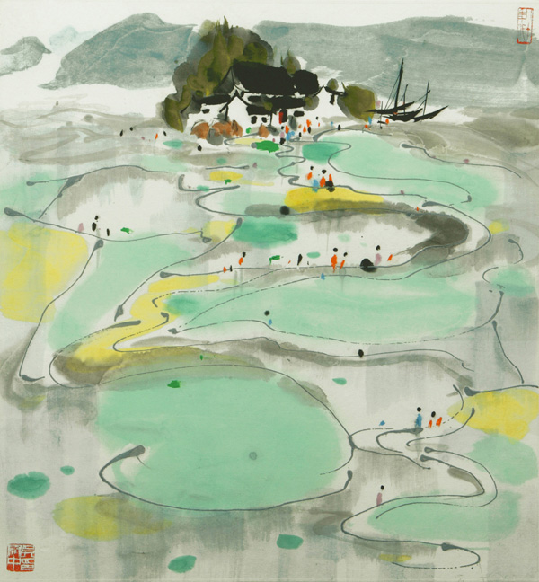 以現代徐霞客自許的吳冠中,尋幽訪勝,採擷美麗風景入畫。他說自己「陶醉於山川風物之異,人情品貌之繁,但也並非旅行寫生,繪圖日記,本旨在採形煉型,營造自家梁園。」1970年代起畫家赴雲南寫生,時間跨越1980年代,一直到1990年代,但以油彩作品居多。這幅《滇池人家》是少有的雲南彩墨風景畫。滇池古稱滇南澤,又名昆明湖、昆明池,位於雲南昆明市的西南。滇池兩岸有山群夾峙,風光秀麗,碧波萬頃,風帆點點,湖光山色,自古即是南方名勝。《滇池人家》的背景以渲染的墨色鋪陳山形、濃墨點出屋瓦以及船桅;前景裡淡彩、留白營造水田曲徑的疏密空間;再由線條來縈繞畫面,點點人群如音符一般富有節奏感。流暢的線條為此畫的靈魂,勾劃出一方優雅山水。