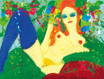 這件作品創作於1977年,當時畫家已然完成從抽象到具象的演變,對於壓克力顏料色彩高飽和度的利用手法更為自如和豐富多變,揮、灑、描線、涓滴、潑灑、平塗,酣暢淋漓。畫面中裸女不著痕跡地精心選用同色系的長筒襪搭配湖藍色的眼妝,在花叢中擺出撩人的姿態。《擁抱我好嗎?》她慵懶地說出她的訴求,眼眸半闔,曖昧而略帶挑逗地望著你。