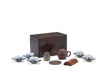 此對茶箱器型方正古樸,渾樸精巧,箱身刻繪山石擺件,茶具等清玩器物,篆刻有吞山人刀四字款識,紋飾雕刻頗具寫實的韻味,箱內配有青花茶盞五件,描繪高士人物畫面。茶托五件與茶盞配套。茶罐一個,為錫質地。紫砂茶壺,壺承,竹質茶則各一。刻工利落灑脫,自然不羈,配以精美紅木收藏箱,可見此器當時必是主人心愛之物。