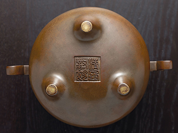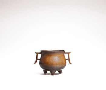 精煉美銅,皮色如熟栗,嫣紅嫵媚。全器圓口斜唇,束頸深腹,腹壁兩側出一對下戟式的尖頭戟耳,耳璫微揚,氣韻生動。圜底,下承三乳足,底面下署方框「清風對飲」雙行四字篆體陽文款。是件銅爐造型秀美,皮色凝膩,深腹與戟耳的款款對話,激盪出「古今珍玩,只此可人」的美哉讚嘆。