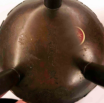 Of ding-form, the deep bowl with an everted rim and upright handles, all supported on three slender cylindrical legs, elaborate taotie masks enveloping the body between elongated keyfret above and stylized cicadas on the legs below, all inlaid with gold wire, the base centered with a four-character Yutang Shi Sou mark.
