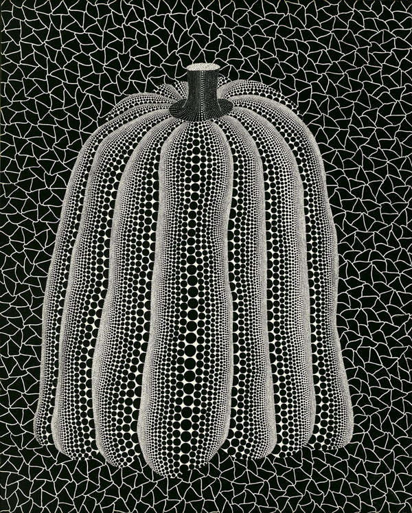 草間彌生對圓點是偏執的,這與她的視覺幻覺有關。她以大量的圓點包覆各種物體的表面,牆壁、地板、畫布、物品、人體、甚至自己。藉由重複性的線條將圓點無限的蔓延,混淆了真實空間的存在,使得觀賞者不自覺的陷入眩暈狀態,不知身處真實或虛幻。此幅同樣以重複的圓點堆疊而成的《南瓜》結合了她兩個最具象徵性的符號:「南瓜」和「無限的網」。