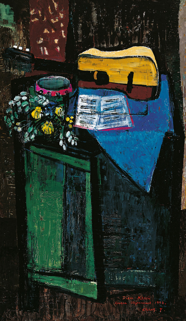 這幅畫其實是第二次重畫,第一次的〈合歡花〉完成於1954年左右,當年曾參加第七屆台灣省美展,榮獲第一名省主席獎。不過省展主辦機關對得獎作品未善盡維護之責,幾經輾轉,這幅畫於1988年竟然重新在台北的某家畫廊,但是原畫的簽名已經遭到塗改,早年簽上的「義」字簡寫,卻被改為「梅樹」,原來的題目也被換成〈藍布上的吉他〉。