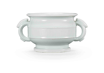 此為白瓷簋式爐,壁薄質堅,細潤沉靜。圓口,束頸溜肩,圓鼓腹,腹下漸收,下承圈足。頸肩兩側出一對鳳式戟耳線條屈曲流轉,簡潔有力。全器古樸自然,具素雅的韻致。