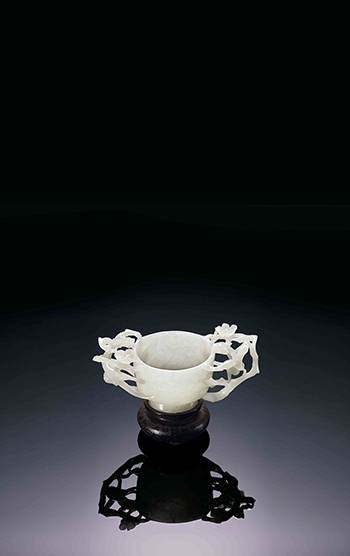白玉雙耳圓杯,圈足。兩旁各鏤空雕梅花螭龍紋,螭龍攀於杯口,梅花盤繞螭龍,口啣杯沿,尾部附於杯腹底邊,肩背高聳,形體誇張,雙邊對映,是明朝特有的雕法。
