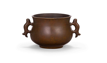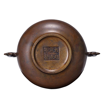 The everted flat mouth rim surmounting the bulging convex sides supporting opposing handles unusually rendered as curving vertical lines of cylindrical section, the foot rim encircling a concave underside bearing a six-character Xuande mark cast in standard script within a rectangular cartouche.