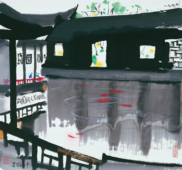 而此幅〈故園故人總相戀〉所欲描繪的是江南充滿美感的庭園,池魚嬉遊的景色。近幾年每回吳冠中回歸故里探遊,總會發現傳統建築被拆除改建,不免唏噓。而描繪故鄉的一切,最讓他感觸良多。吳冠中一生走遍大江南北,採擷各地美的種子、幼苗,在他的繪畫中已經栽種出一片美好家園。〈故園故人總相戀〉一畫裡墨韻梳密有致,簡筆描雕樑畫棟,表現建築的樸實古雅,線條優雅畫出池魚的柔美,處處呈現老畫家的不凡的功力。