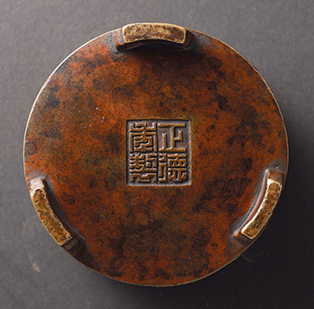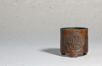 Made with golden bronze, the censer has a solid feel in hand. The purplish-red body shows patches of peeling. This piece consists of a flat and round mouth and a cylindrical belly with three sets of begonia blessings on the walls. The pattern of blessings are filled with precious adornments and an embossed Arabic script. The flat bottom is held up by three short Drifting Cloud legs. On the bottom, embossed are two lines of four-character Seal Script read Made in the Zhengde Period in Chinese. The overall style of the censer is modest and simple. With the use of Arabic script for decoration, the piece deepens the reminiscence of ancient times.