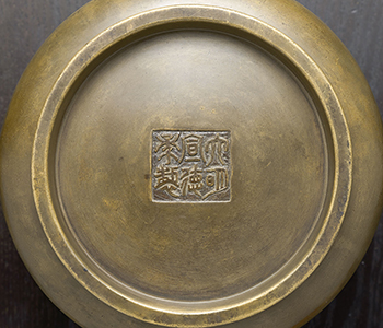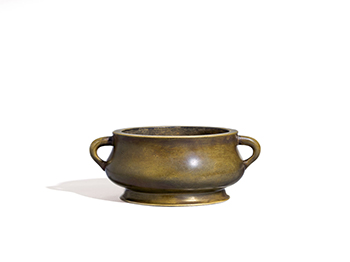 銅質純美,皮呈蟹殼青。圓口平板唇,直頸溜肩,頸腹壁兩側出一對蚰龍耳,蚰龍線條簡練優美。扁鼓腹,腹下漸斂,下承外撇廣圈足,底面中央署方框「大明宣德年製」三行六字篆體陽文款。是件銅爐口緣與圈足的直徑比例相當,在扁鼓腹的曲線連動下,形塑一種安定肅穆的視覺觀感,這也是宣爐抽象線條令人醉心的最大關鍵。