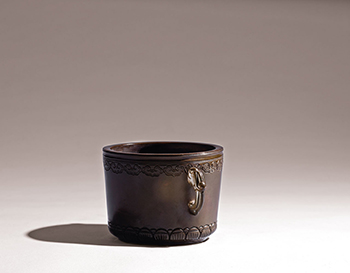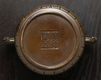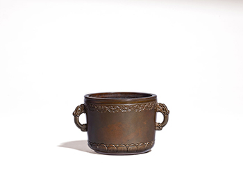 銅質細沉,栗紅色皮,凝潤肅穆。圓口平唇,筒式腹,腹壁兩側出一對夔龍耳,近底部漸斂,下承淺圈足,底部中央署方框「瀾柳書堂」雙行四字篆體陽文款。是件銅爐近口緣外壁與底部各飾有兩道寬帶紋,上端寬帶紋下飾一匝如意雲頭紋,下端寬帶紋之上壓飾一圈蓮瓣紋。全器除造型線條外,刻意以如意蓮瓣紋增添華彩,別有不同風味。