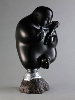 此件作品《雪峰仙蹤》完成於2007年,為李真「大氣神遊」系列的最新創作之一。李真創作從中國意境粹取,作品帶有一種「仙氣」,強調的是「遊」,以空明境界讓觀者沉澱與紓解,在精氣神內自在悠遊,用最真的態度來面對生命。就雕塑肌理與線條關係,李真表現出高超的融合性,看似簡約,但在光影下確充滿著變化,圓滿造型中依然有其精妙的神韻。左握拂塵,右推掌印,雙足交叉而立。「拂塵」在道家意涵中有拂去塵緣超凡脫俗之意,也是道門中人們外出雲遊隨身攜帶之物。仙風道骨油然而生,畫龍點睛之妙為雕塑增添神秘感。在質感上用中國墨黑色帶有霧亮處理形成特有效果,使觀者有既重又輕的感覺,銀的溫潤與黑的能量,既對比又和諧,是一件耐人尋味的精品。
