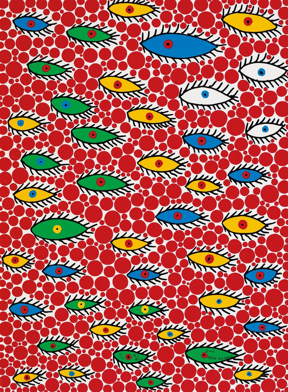 簽名右下:Yayoi Kusama 2006 空を飛ぶ目