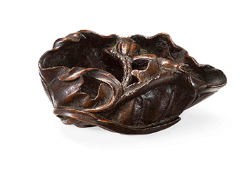 This washer is carved in the form of a furled lotus leaf, borne on a curled stalk issuing lotus flowers, the rim with lotus leaves on each side.