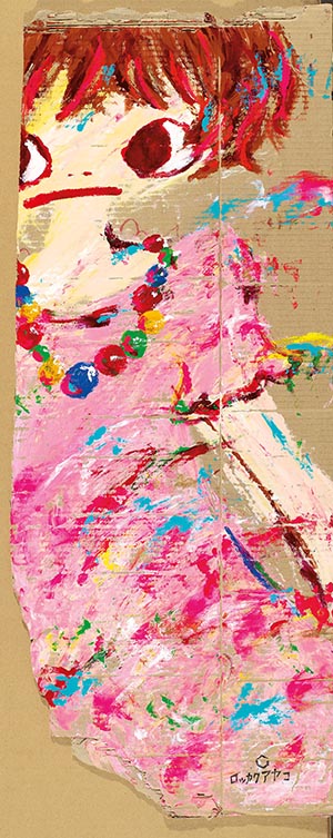 六角彩子,1982年1月24日出生於日本千葉縣。2001年開始走創作之路,2002年投入報名藝術節展覽。起初不是在素描簿上塗鴉,就是以瓦楞紙板作畫。在廢棄的瓦楞紙上作畫,即興、街頭、又有貧窮藝術特色。畫畫讓她開心,樂此不疲。因在GEISAI藝祭上屢次獲獎,2006年即為六角彩子贏得瑞士、法國與美國等國際參展機會,以及荷蘭畫廊的全球經紀代理。