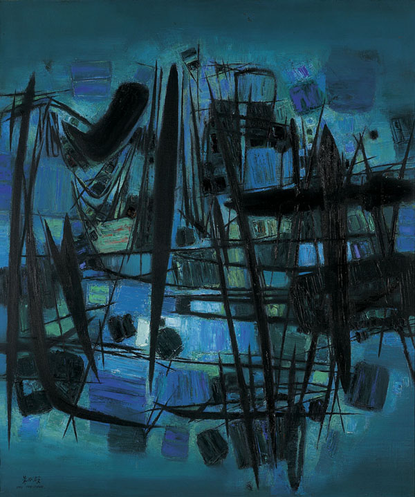 位於巴黎的亨利葉.勒讓特畫廊(Galerie Henriette Legendre)是朱德群在法國第一間簽約的畫廊,從1958年起開始合作,時間持續有六年。在勒讓特畫廊的運籌栽培之下,朱德群能躋身巴黎畫派之列,也打開國際畫壇的知名度。1960年前後是他抽象畫轉型的重要階段,尤其變化無窮的書法性線條成為他個人的一大特色。他偏愛在單色的繪畫背景,運用水墨的渲染效果,營造出迷人的韻味。而在錯綜複雜的線條之間,濃厚的小方塊明亮的形體如凝結寶石,分布在畫面中,而光線在其中轉折、變化,形成光源,穿過煙雲向外湧出。