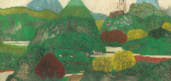 《青山四面》為1970年代的佳作,余承堯以靈活的筆觸皴擦,堆疊出畫中一塊塊奇異山石,以及一叢叢色彩明亮的茂密樹林。整體結構密實,構圖講求層次,空間起伏多變,細膩的線條中提煉出抽象質感的山水精神。余老的繪畫如同詩賦,以及他鍾情的南管音樂,節奏細膩高雅文靜。情到深處自然獨妙,充滿新意。