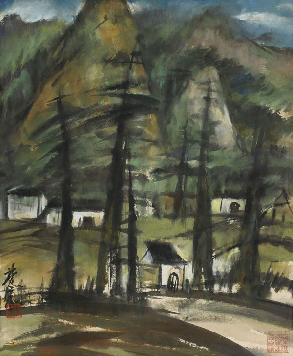 《秋林》採用畫家最常用正方構圖,色彩濃重沉鬱,用筆洗練率真。前景處,黑墨勾勒出高坡上高聳的林木,林中白牆屋舍與中景處山腳下村落相映成趣。遠處山巒則以黑色勾勒山體,赭色與青色漸次暈染,墨與色在方寸紙間躍動,進而使得畫面空間層次分明。