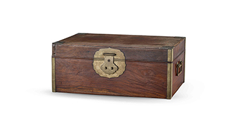 This Huanghuali Box is of rectangular section, the cover and body constructed with straight sides with exposed dovetail joints, the sides completely plain, the cover hinged on the back of the chest, the front with a circular metal plate with lock receptacles and a lobed ruyishaped lift-up hasp, each side with a round handle. This Huanghuali Box is a valuable addition to any collection of small-scaled furniture.