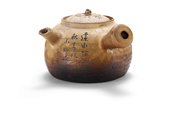 此壺白泥質地,繪「葦間月下的鴻雁」,一支蘆花,用筆蓬鬆,輕盈隨風;所畫鴻雁,一筆而成,由濃而淡;羽翮柔軟潤澤,無不情趣橫溢。年代久遠,有使用痕跡,但器物保存完成,可見為主人飲茶經常使用的心愛器物。