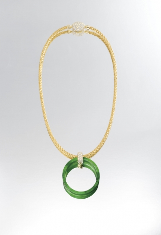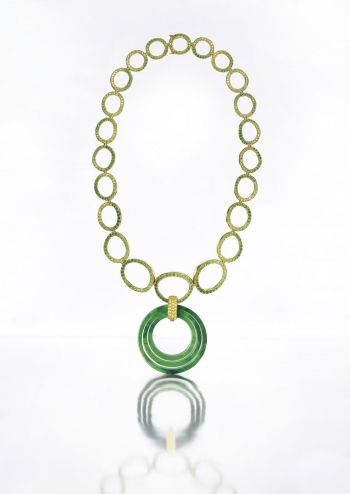 A JADEITE, DEMANTOID GARNET AND DIAMOND PENDANT NECKLACE, BY GIMEL