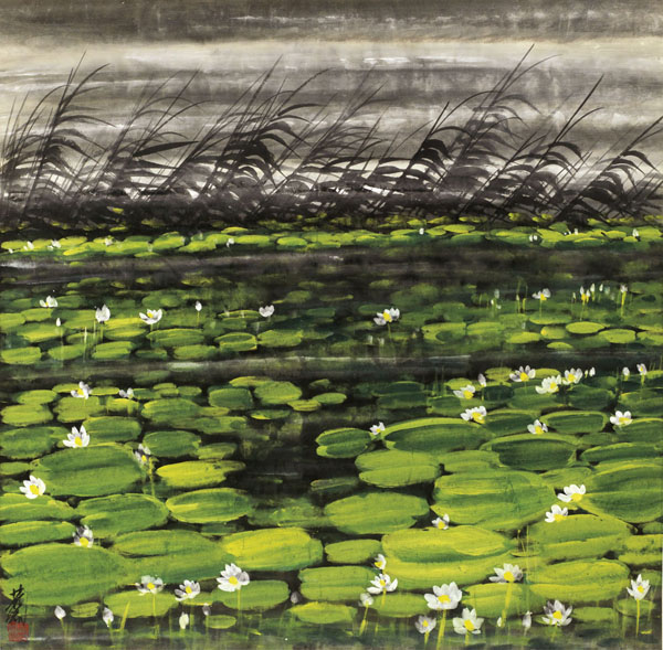 同時,這幅作品的形式作為40-70年代林風眠典型的方紙布陣繪畫,亦採取其在風景描摹時多使用的「平遠式」構圖手法,其特色是平和、寧靜。處理這種構圖,他很注意平直中的斜線、弧線和圓形,給平和的狀態以動勢與活力。如畫中蘆葦迎風的斜態,水與岸的平直,及荷葉重複的圓形,都是經過精心安排,形成穩定與變化和靜與動的對立。這些元素在畫面上形成了一種統一,而這種多樣的統一中,形狀的相似性,光和色的變化及平面空間裡的分割,都起了和諧的作用。