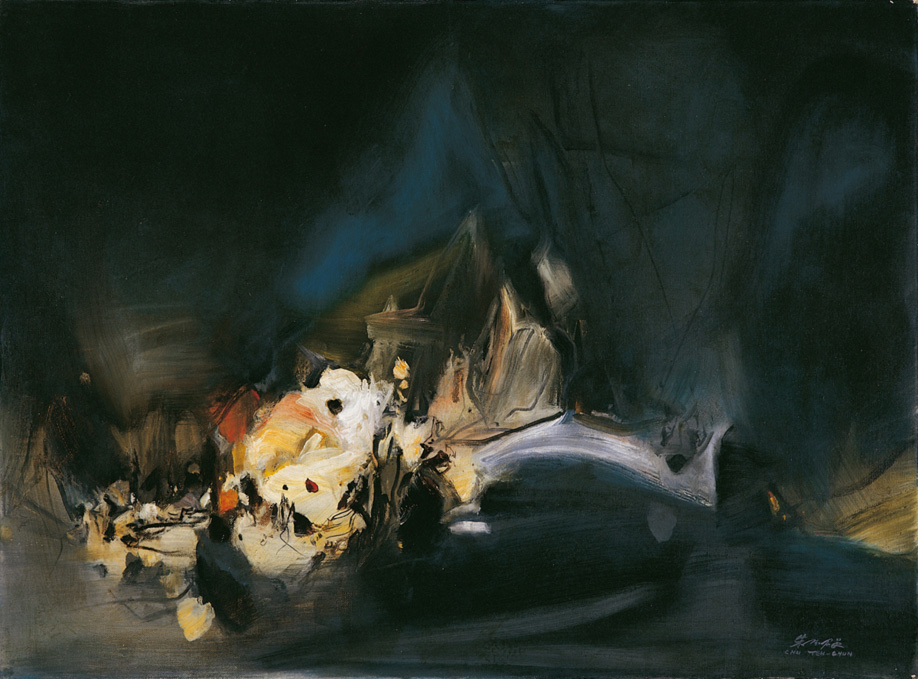此幅1972年創作的〈結構 466號〉即為這一時期之作,色系沉穩,筆力優厚,狂放有勁,錯綜糾結的線條產生動感,構出一種強勁的氣勢,宛如醇厚有力的交響曲,在展現自然韻味的同時,更可體會到畫家本人的熾烈情感,實為朱德群早年油畫創作裡不可多得的佳作。