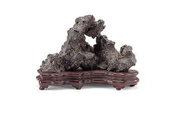此石為天然的靈壁石所製成,硯山高絕,兀立崢嶸,石勢縱恣;器表嶙峋,滿布皴褶、紋路與凹坑;又有險峻幽壑、貫通透洞穿鑿於其中,藝匠技藝精湛,於方寸之間收攝大化山水,意境優美,巧奪天工。配有底座,為文房陳列觀賞精品。