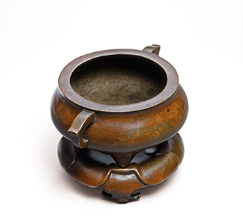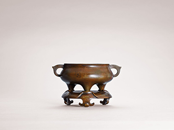 銅質精純,手感沉實,皮色棗紅,若紅霞氤氳。通體圓口平唇,溜肩垂腹,肩兩側起一對扳耳,腹下急斂,下承三乳足,底部署方框「上谷山人」雙行四字篆體陽文款,爐下附原配如意雲頭三足流雲式底托。是爐寶蘊光彩,造型端莊沉穩,線條優雅舒暢,特別是扳耳的飛揚氣韻與乳足的肥碩穩重,更是相得益彰。