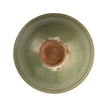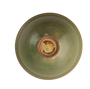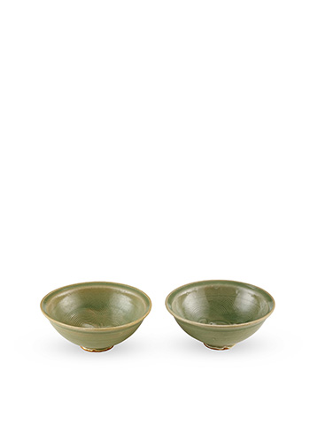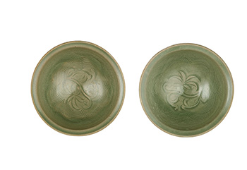 宋 耀州窯青釉刻落花流水紋碗(一對)