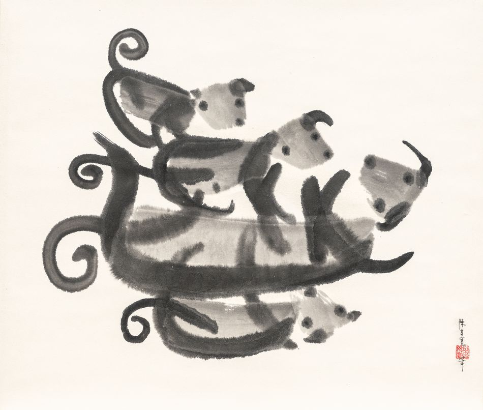 活躍於歐美數十載,陳其寬的影響力亦迴響亞洲,台北國立歷史博物館於1980年為其舉辦大型回顧展。陳其寬自美返台後於東海大學任教二十逾年,本件作品作於1981年,正是其藝術成熟期。畫中小狗以極簡的水墨線條構成,在墨色的濃淡間,犬犬相疊,趣味橫生。