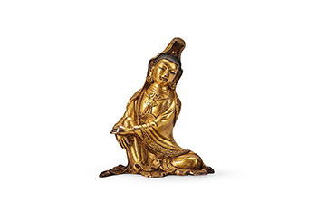 此尊观音造像为清代乾隆时期汉藏风格,通体鎏金,观音头戴巾,高发髻,耳坠花铛,胸前饰有精细的璎珞,面相圆润,双颊饱满,双目微合,嘴角微扬,微含笑意。与西藏以及蒙古造型不同的是,这尊观音为汉人面容,然其衣服、装饰有藏传佛造型特征,具备乾隆时期佛造像特点。其胸前佩戴华丽饰链璎珞,着菩萨装,花纹繁缛精美薄衣。贴身,衣折流畅自然,如同流水。菩萨身姿挺拔舒张,双手抱单膝,呈左跏趺坐姿,曲左腿,舒右腿。姿态洒脱,无拘无束,神态自若,是为自在。本品最为赞叹的正是自在观音的姿态,腰身所成弧线优美,线条张弛有度。