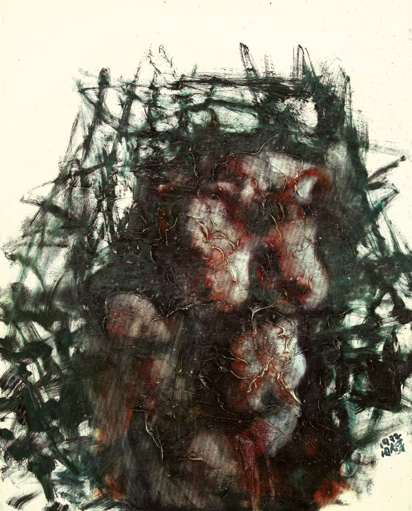 山石一直是極受古今藝術家青睞的課題,周春芽從1990年開始創作了「山石」系列,有別於于「桃花」和「綠狗」、「黑根」等系列,藝術家在「山石」系列中引入了新的繪畫技巧和材料,該系列石頭的表面都覆蓋著一層奇怪的增生物質,類似浮雕一般的筆觸給平面的作品增加了立體的延展。加之藝術家充滿情緒的描繪,使得畫面中原本安靜無聲的石頭,充滿了各式各樣複雜的情愫。