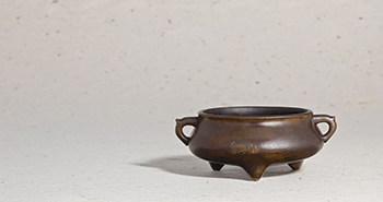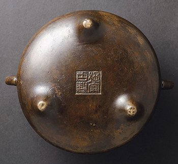 銅皮如棠梨,古雅清妙。全器圓口起唇緣,坡腹垂肚,腹壁兩側安鑄一對扳耳,底面下承三乳足,三乳足間署方框「施家古製」雙行四字篆體陽文款。是件銅爐線條圓熟,具輕盈之姿,比起線條方折沉重的押經爐,另有一番不同風味。