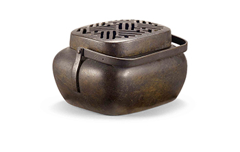 小巧玲瓏,盒蓋幾何線條鏤空。暖手爐是宮廷乃至民間普遍使用的掌中取暖工具,裡面放火炭或尚有餘熱的灶灰。