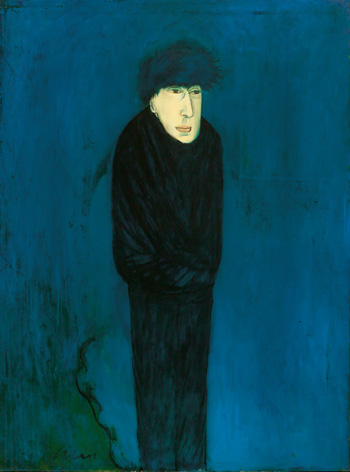 此幅畫作,主題為藍衣男子,畫面中人物有著修長纖瘦的體態,眼神憂鬱疏離,神情內斂且沉靜,展現出較優雅、安靜和東方文人的氣質。線條與用色的簡約,則營造了孤寂憂鬱的氛圍。藝術家藉此描繪出這些孤獨心靈在面對理想和現實相悖時,選擇默然以對,不流俗的風骨氣節和脫俗的凝重優雅,傳神地顯露於作品中。