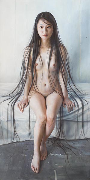 諏訪敦以其天賦的超卓寫實繪畫技巧聞名,作品《刻板印象-日本人02》採用了古典的繪畫技術,達到了宛如一部紀錄片的效果。藝術家運用特異的技法,跨越了原本以具象繪畫為習的流派性,去嘗試著「觀看和記錄」的擴展視感。作品中的女主角看似單調地靜坐在床前,凝重的空氣在一根根頭髮間舒展,皮膚下血脈起伏,手臂上的髮絲隱隱若現,自然光線如一瓢清水在身體山迴盪,懸浮於一縷綿綿的安詳。女性柔嫩的肉體看似是作品的全部,但在手和腳上都有光影的眷顧,透過女體到背景冰冷的牆面,似乎有某種跡象,一種由表相刻板而上升到遠超表面的印象,女主角彷彿正在畫布上呼吸。