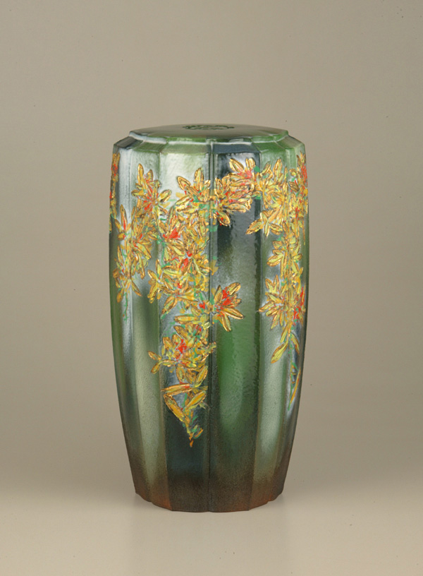 以器物造型來看,所作的造型都很單純,為的是強化器物上釉彩的呈色,或所繪主題的效果。至於色釉的處理,綜合早期對明清琺瑯彩的摸索經驗,在製作上以深色化妝土打底進行刮刻,素燒後再以傳統高溫長石釉,以1260~1300℃燒結(自1996年後改用美國進口雕塑土調整為1230℃),上完琺瑯彩第三次(稍低溫)烘燒,最後描上金、銀,低溫烘燒後才算完成。這樣以深色打底回火多次燒結的目的,前者應用傳統技法,上層釉彩亮麗而沉穩;後者則借用清代所發展出的琺瑯彩技法,琺瑯彩具有不透明性使呈色具有油彩的質感;多次回火更添加釉彩的層次感,因而形成其陶作特有的效果與層次。