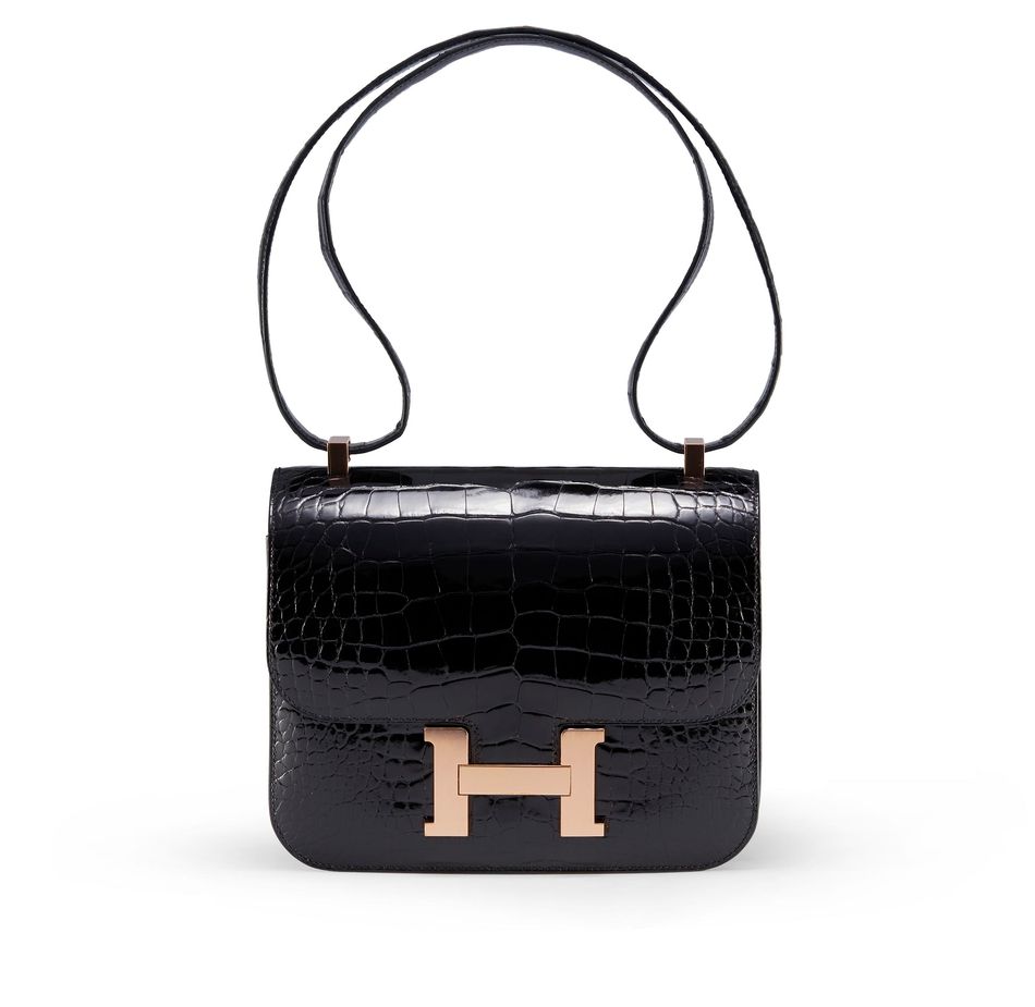 亮面黑色ALLIGATOR短吻鱷魚皮24公分CONSTANCE包附金色金屬配件