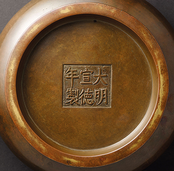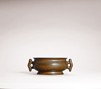 銅質細緻平滑,皮色艷如胭脂,又比例寬矮沉雄,誠為難得美器。通體圓口平唇,束頸廣腹,腹下漸斂,下承廣圈足,圈足直徑略小於口緣,腹壁兩側起一對圓柱式戟耳,底部署方框「大明宣德年製」三行六字楷書陽文款。戟耳爐原有執戟安邦之意,為刑部陳設用器,然是類戟耳爐多數光素無紋,能以素風懾人心魄。